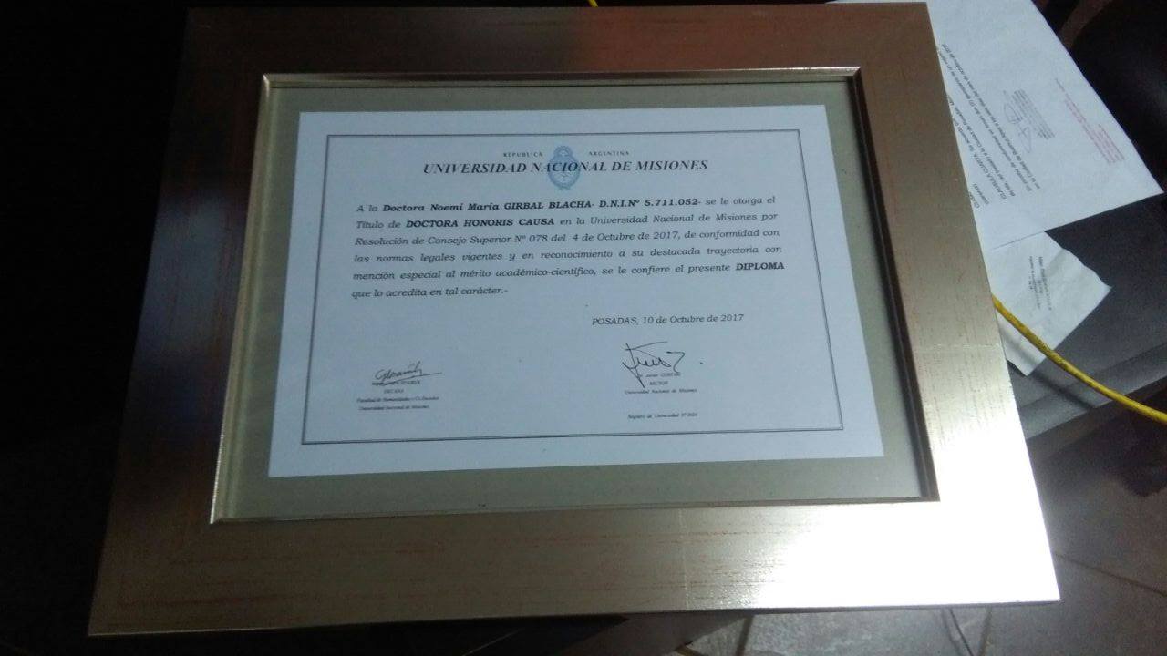 En el marco del XXXVII ENCUENTRO DE GEOHISTORIA REGIONAL. “PROBLEMÁTICAS REGIONALES: FRONTERAS Y CONFLICTOS”, realizado el 11, 12 y 13 de octubre de 2017 en la Facultad de Humanidades y Ciencias Sociales de la Universidad Nacional de Misiones, tuvo lugar la Ceremonia de entrega del Doctorado Honoris Causa de la UNaM a la Dra. Noemí Girbal – Blacha.