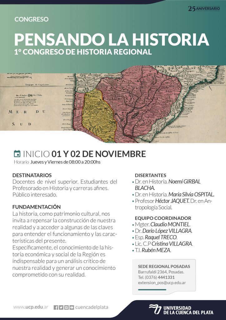 La Facultad de Ciencias Empresariales en la Sede Regional Posadas de la Universidad de la Cuenca del Plata invita a estudiantes, educadores, profesionales y apasionados por la historia a participar del 1° Congreso de Historia Regional “Pensando la Historia” que tendrá lugar los días 01 y 02 de noviembre, de 08:00 a 20:00hs, en las instalaciones de la Universidad, sita en calle Barrufaldi 2364 de la ciudad de Posadas.