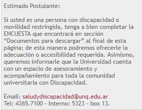 Cualquier otra consulta deberán comunicarse a los siguientes contactos de lunes a viernes de 9 a 18 hs. informes_posgrado@unq.edu.ar o llamando al 4365-7100 Int 5382