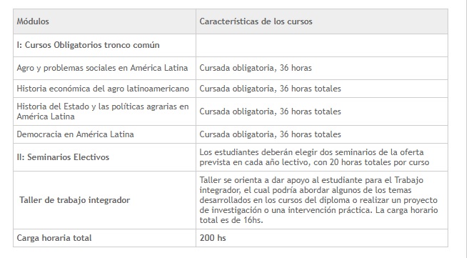 Este Diploma será una actividad académica donde se vinculan dos Centros de Estudios Interdisciplinarios con una extensa trayectoria en el área y con prestigio académico en sus respectivos países. Tiene por objetivo conformar un grupo de expertos en estudios académicos latinoamericanos que cuente con herramientas metodológicas y marcos referenciales teóricos que permitan analizar las continuidades y cambios de los diferentes espacios rurales latinoamericanos. Con la finalidad de desarrollar este campo de investigación, se considerará como eje vertebrador las estrategias diferenciales de los actores sociales, instituciones y del Estado en el marco de los procesos de construcción, consolidación y conformación de los estados nacionales latinoamericanos. La propuesta curricular integra distintas perspectivas de análisis, haciendo énfasis en el estudio de los problemas agrarios de Latinoamérica, con especial atención a los procesos ocurridos en el siglo XX y hasta la actualidad. Estas problemáticas se abordarán desde una perspectiva amplia y multidisciplinar, en relación con factores externos e internos, conforme a los distintos grados de complejidad pertinentes a los diversos tiempos y coyunturas históricas. Los destinatarios serán docentes con formación terciaria e investigadores en etapa de iniciación y otros profesionales universitarios no contemplados en las categorías anteriores.
