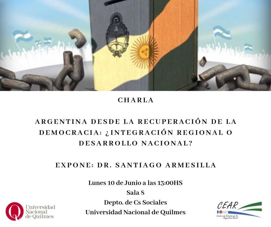 El pasado 10 de junio se desarrolló la charla «Argentina desde la recuperación de la democracia: ¿Integración regional o desarrollo nacional?. La exposición estuvo a cargo del Dr. Santiago Armesilla.
