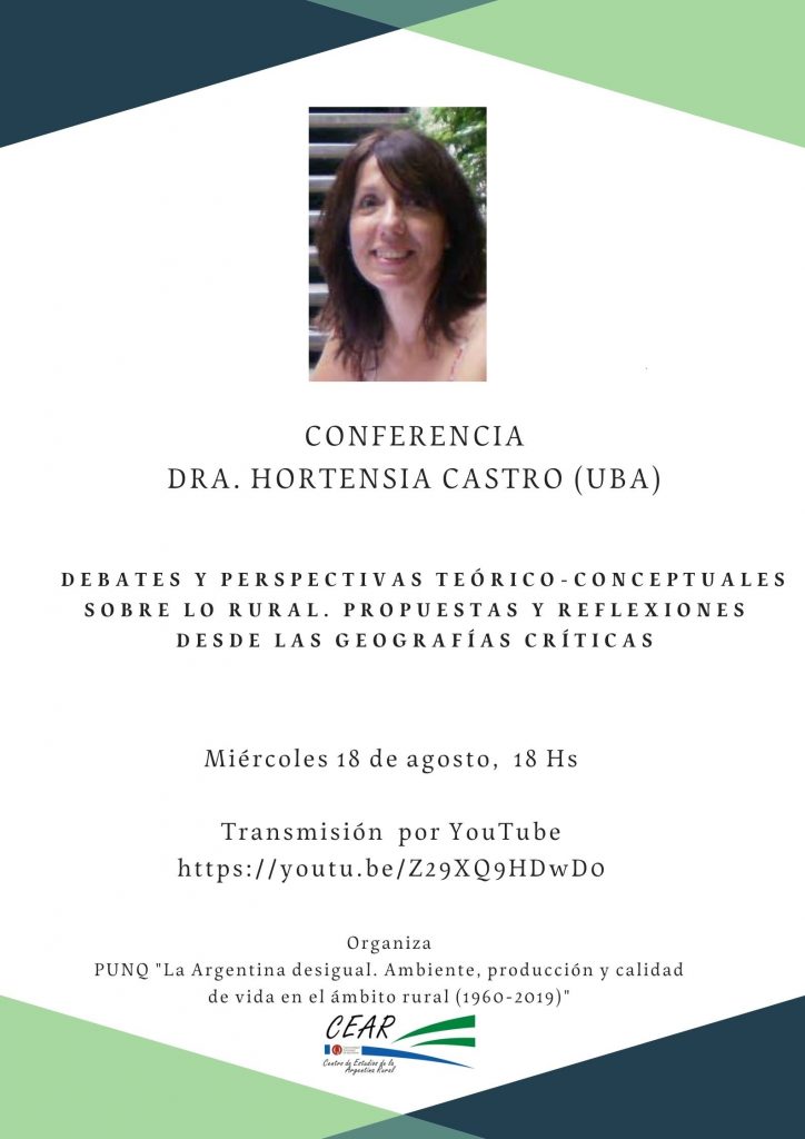 El miércoles 18 de agosto de 2021 la Dra. Hortensia Castro (UBA) brindó una videoconferencia titulada “Debates y perspectivas teórico-conceptuales sobre lo rural. Propuestas y reflexiones desde las Geografías críticas”. La misma se puede visualizar desde el siguiente link: https://www.youtube.com/watch?v=vH10rQvAFsg