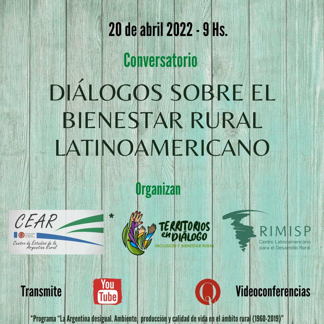 El 20 de abril de 2022 se realizó el conversatorio “Diálogos sobre el bienestar rural latinoamericano”, organizado por el Programa “Territorios en diálogo. Inclusión y bienestar rural”/ RIMISP y el Programa “La Argentina desigual. Ambiente, producción y calidad de vida en el ámbito rural (1960-2019)”/ CEAR-UNQ. El encuentro se puede visualizar en este link.