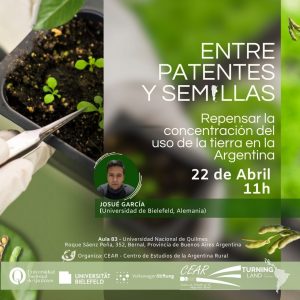 El martes 22 a las 11hs. el en aula 83 de la UNQ nos visita el Dr. Josué García de la Universität Bielefeld (Alemania) y disertará sobre el tema «Entre patentes y semillas: repensar la concentración del uso de la tierra en la Argentina».