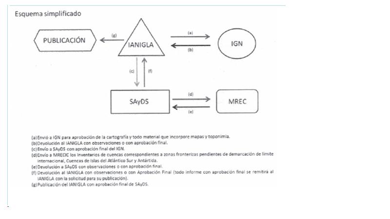 Como se evidencia en la figura anexa a esta resolución, si bien el IANIGLA es quien inicia y finaliza el proceso que deriva en la publicación del Inventario, tal como queda expuesto en las resoluciones de 2015 a 2017, es la autoridad de aplicación ambiental (SAyDS/MAyDS) la que autoriza la publicación, lo que incluye las cuencas y subcuencas hidrográficas. En el proceso interviene también el Instituto Geográfico Nacional (IGN), que valida la cartografía, y el Ministerio de Relaciones Internacionales y Culto (MREC). No debe descartarse tampoco, que esta zona tiene importantes problemas de demarcación con el vecino país de Chile y esto le ha dado a la Cancillería un rol significativo, como consta en la ley y en el gráfico de la resolución.