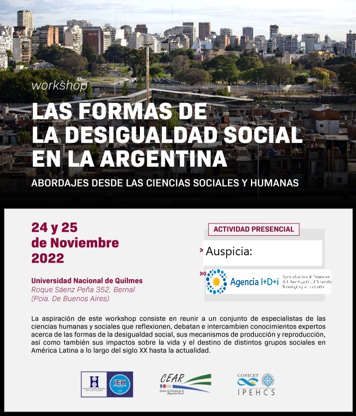 El CEAR, junto con el Instituto Patagónico de Estudios en Humanidades y Ciencias Sociales (Universidad Nacional del Comahue – CONICET) y el Instituto de Estudios Históricos (Centro de Estudios Históricos «Prof. Carlos S. A. Segreti» – CONICET), invita a participar del 3° Workshop «Las formas de la desigualdad social en la Argentina. Abordajes desde las ciencias sociales y humanas» a desarrollarse los días 24 y 25 de noviembre de 2022 en la Universidad Nacional de Quilmes de manera presencial.