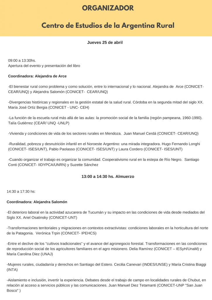 El pasado 25 de abril se desarrolló el workshop «Una mirada histórica al bienestar rural argentino. Debates y propuestas de análisis», coordinado por Alejandra de Arce y Alejandra Salomón, ambas investigadoras del Centro de Estudios de la Argentina Rural.